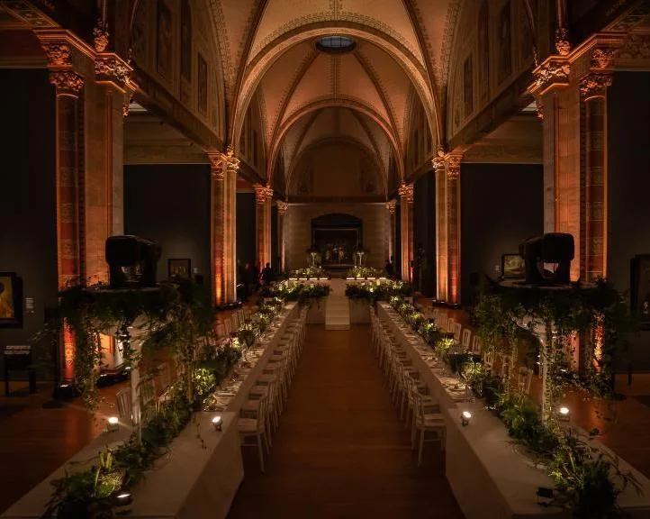 Circular table layout, bespoke floral arrangements, and a customized menu respecting museum guidelines.