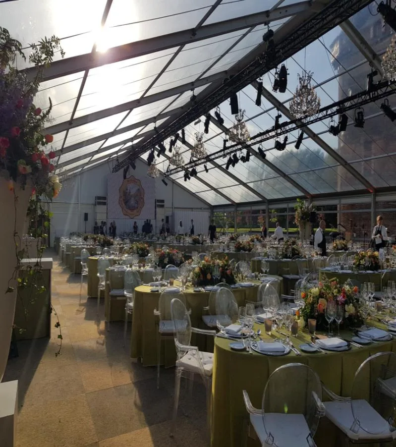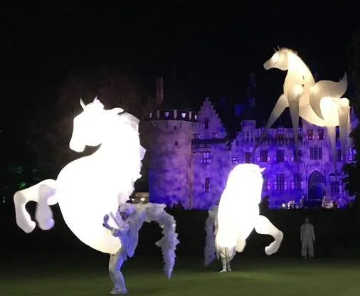 A custom-built tent over the castle’s moat hosted a breathtaking gala with footmen, stilt performers, and a dramatic lighted horse show.